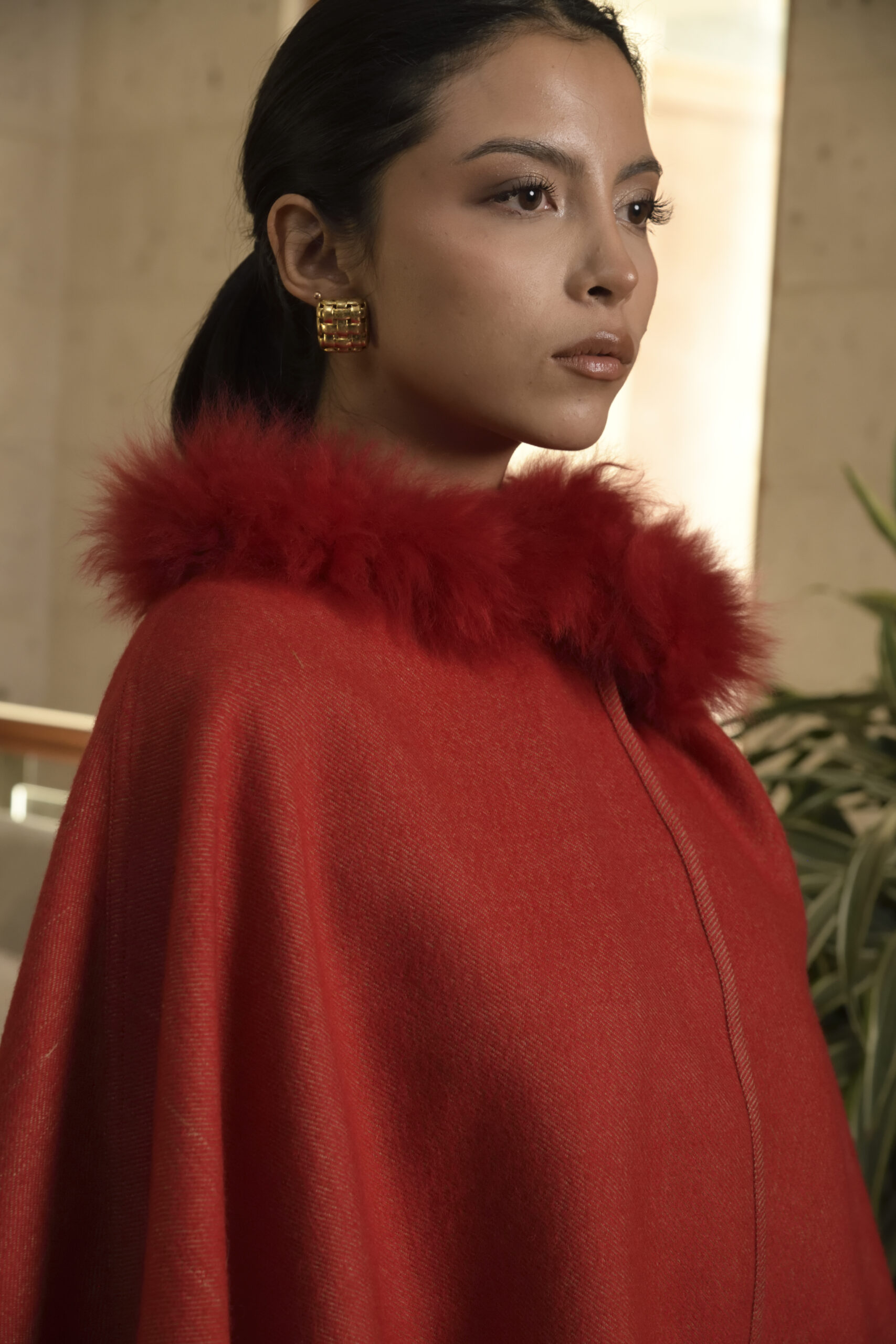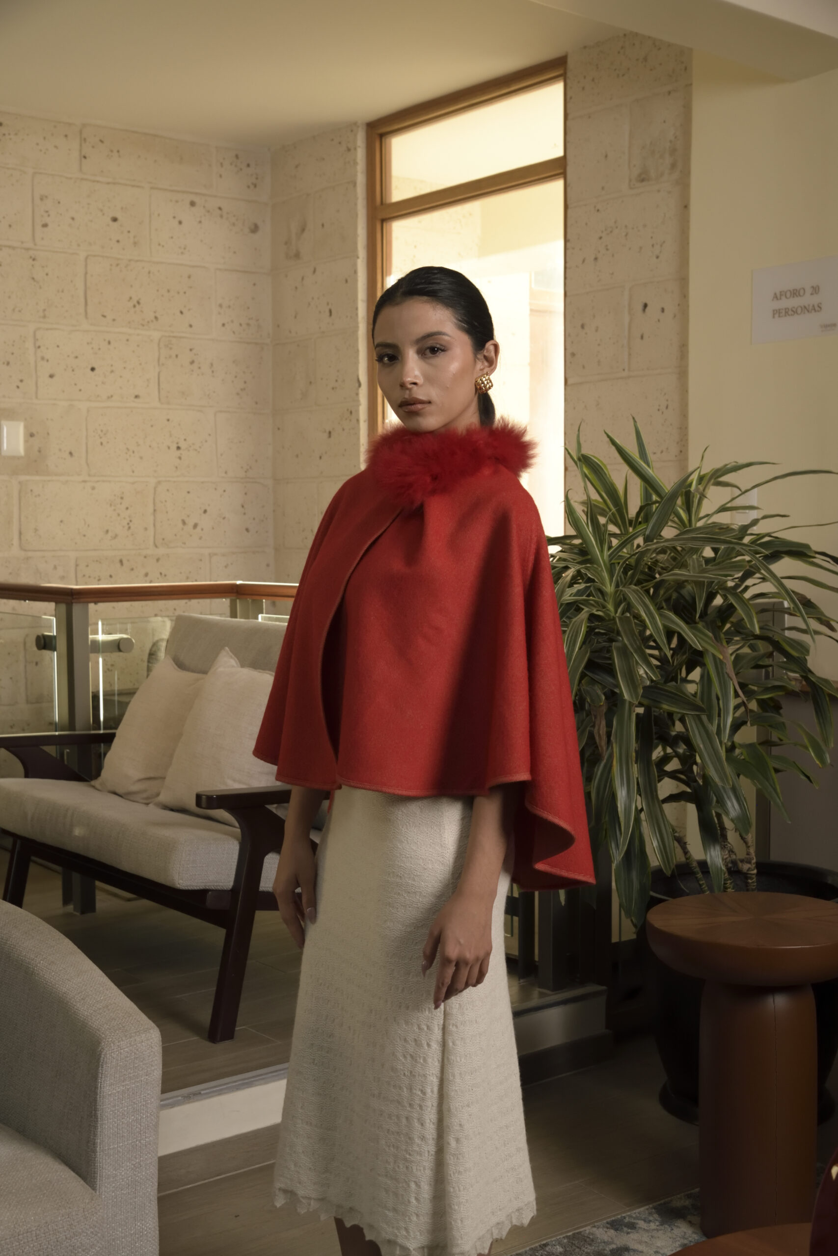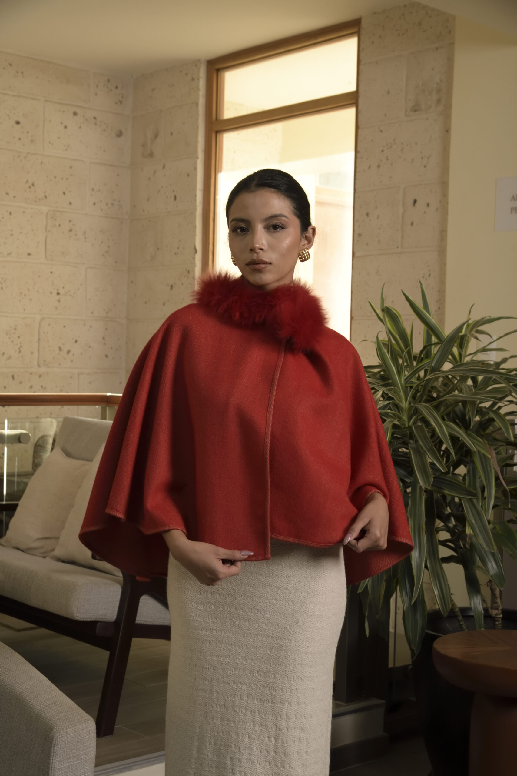 Envuelve tu estilo con nuestra exclusiva capa Fergie de baby alpaca. Con detalle de peletería en el cuello te brindan calidez y distinción inigualables.